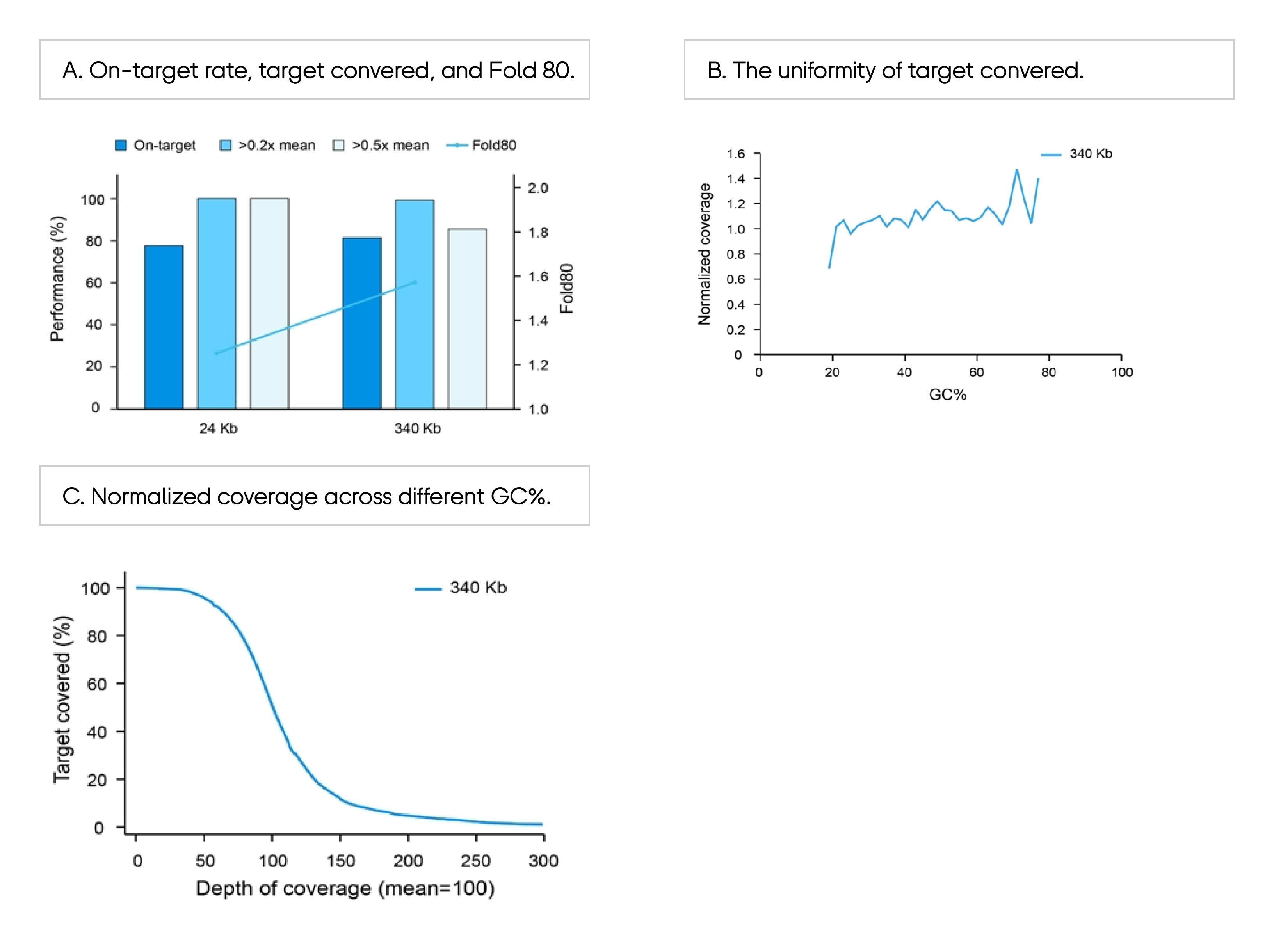 GCATbio provides an IVD company with a customized panel service for screening multiple cancers. The Panel size is 346 kb, covering 1460 target sites, including 210 indels and 91 RNA fusion sites. Based on GCATbio's unique probe design tool, a total of 3034 probes were designed. Sequencing results showed excellent probe uniformity, with an overall coverage rate of 99.1% and an on-target rate of 82%.
